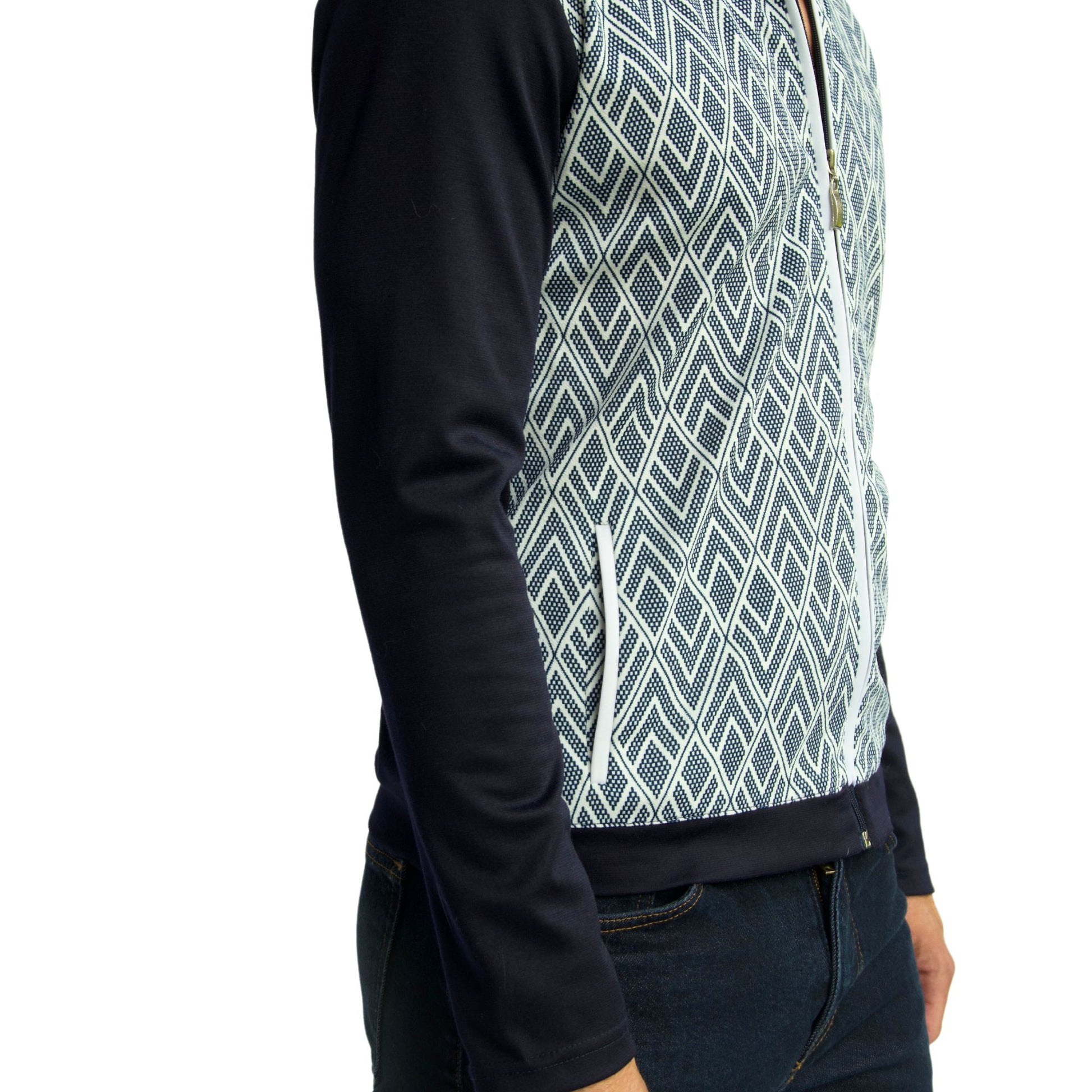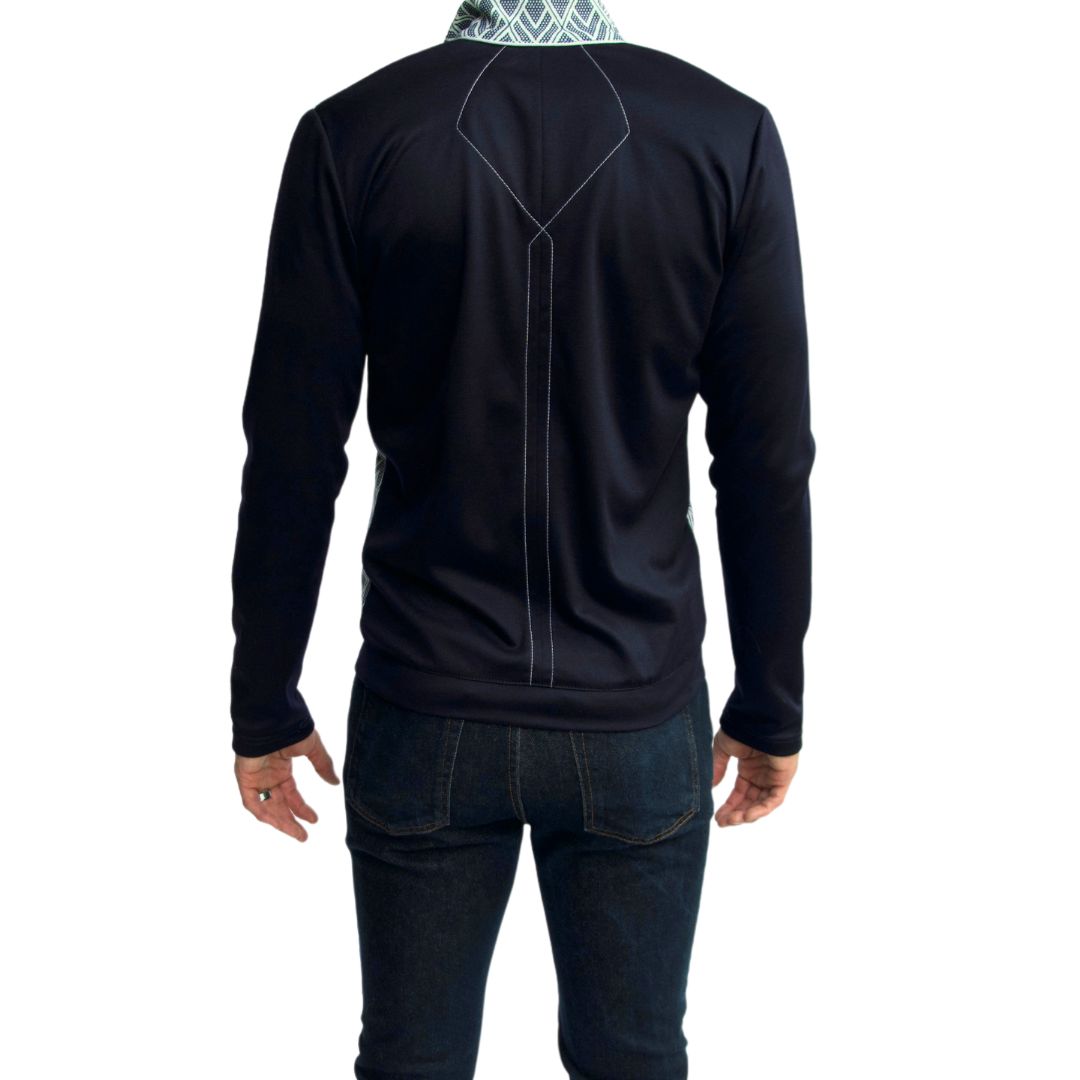 Turn heads and command attention with this limited-edition men's geometric athleisure jacket. A bold fusion of black, blue-black, and white in a striking geometric pattern creates a statement piece that's perfect for the man who demands style without sacrificing comfort.